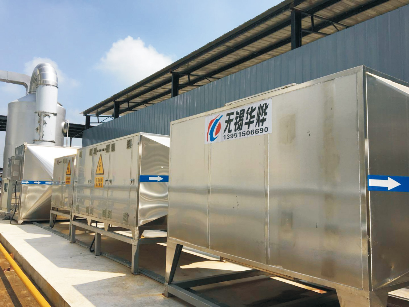 等离子设备内,其设备内设置初效过滤,其主要目的是利用微孔吸附过滤原理,进一步去除残留污染物质,剩余污染物质进入等离子设备内,在外加电压的作用下,气体被击穿,使污染在极短的时间内发生分解得到净化。